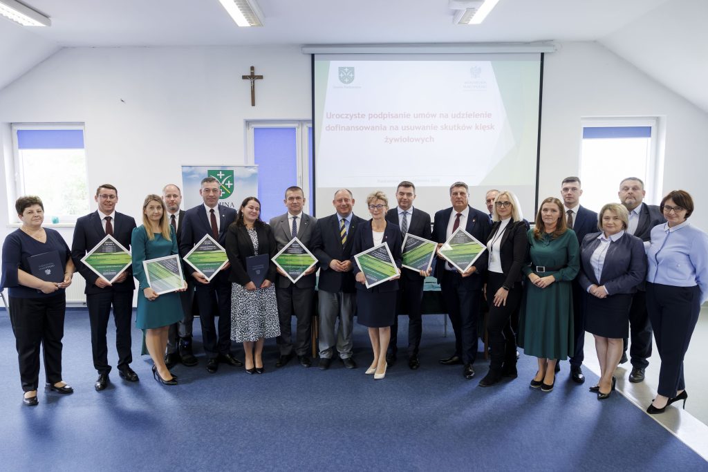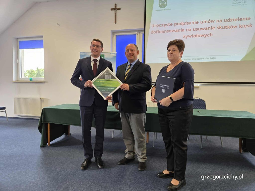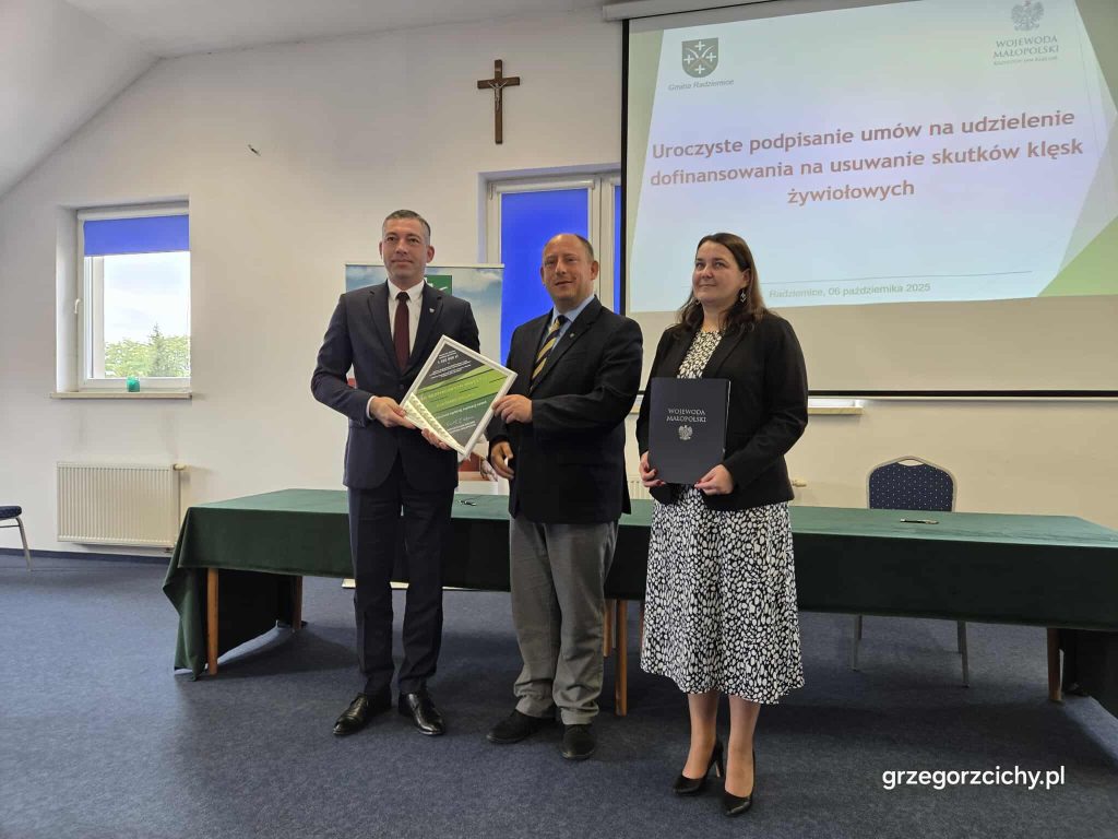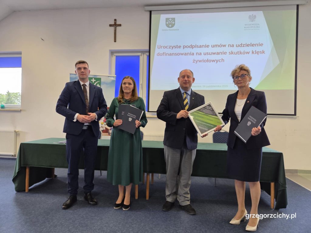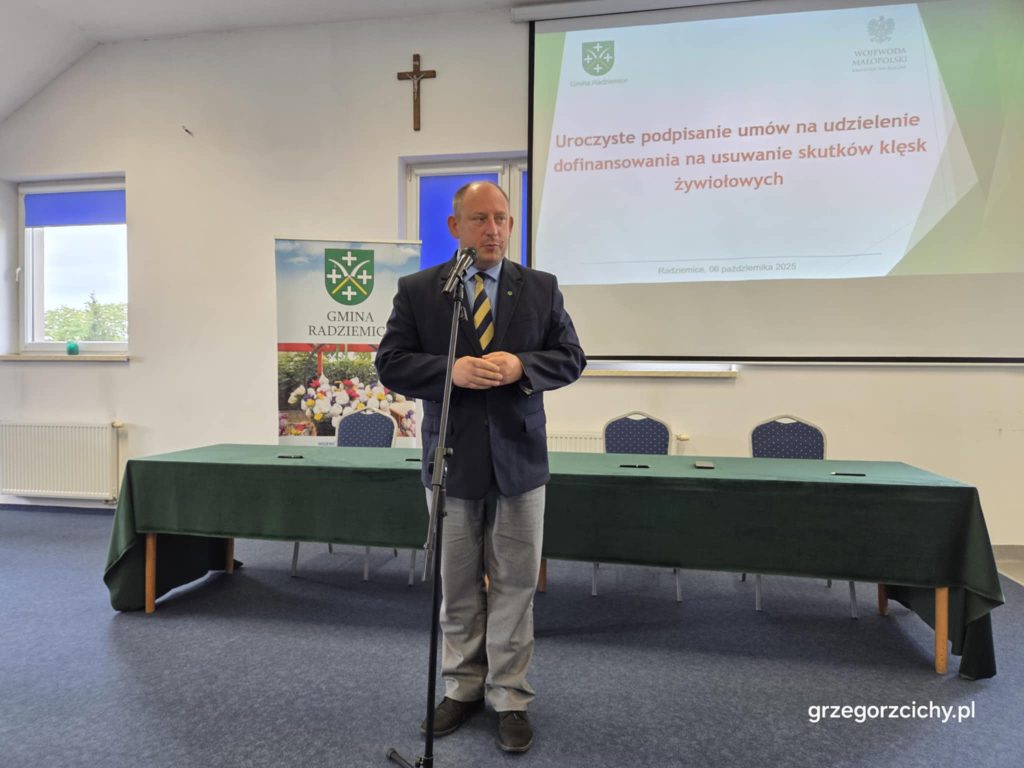 W poniedziałek 6 października 2025 roku w Gminnym Ośrodku Kultury w Radziemicach przedstawiciele samorządów z powiatu proszowickiego podpisali umowy na dofinansowanie w ramach usuwania skutków klęsk żywiołowych z Wojewodą Małopolskim Krzysztofem Janem Klęczarem.